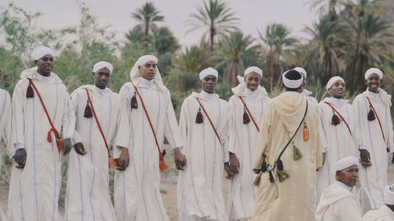 The Ahwach ceremony, historically performed around the time of the harvest, celebrates community. It is inspired by the concept of a nucleus, as the word Ahwach specifically comes from “hawch,” or the (traditionally) circular wall that surrounds the house. It also means the gathering. Ahwach ensembles are commonly composed of 20 to 120 people.